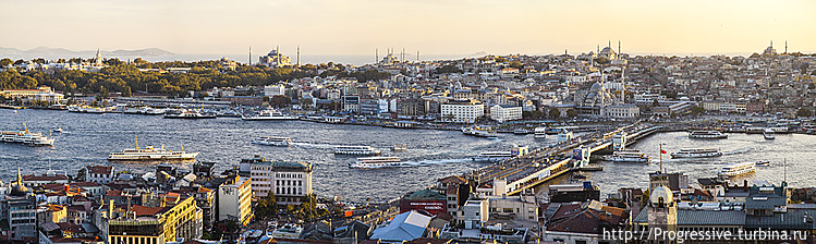 Чтобы примерно понять, какой вид откроется перед вашими глазами, я снял панораму из 10 кадров. Итак, на переднем плане Галатский мост и пролив Золотой Рог, за ним Новая мечеть, левее на панораме видна Голубая мечеть, Святая София и Дворец Топкана, вдали виднеется Мраморное море.