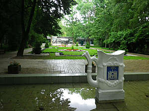 Заходим на территорию курортного парка. Ещё до поездки в Старую Руссу меня пугали непомерными строгостями и требованием об обязательном предъявлении паспорта при проходе на территорию курорта. Но, то ли информация была преувеличенной, то ли накрапывающий дождь испугал охранников, а я зашел в парк совершенно свободно.