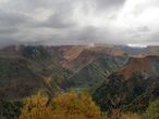 Собственно, этот пасмурный и холодный день тоже был по-своему прекрасен. Глядя на тяжелые тучи, оседлавшие вершины гор и лохмотьями сползающие вниз по их ржавым от осенней травы бокам, я думала, что это просто удача — запомнить Кавказ таким неприступным, подчёркнуто грозным.