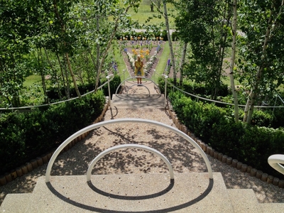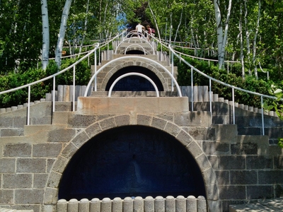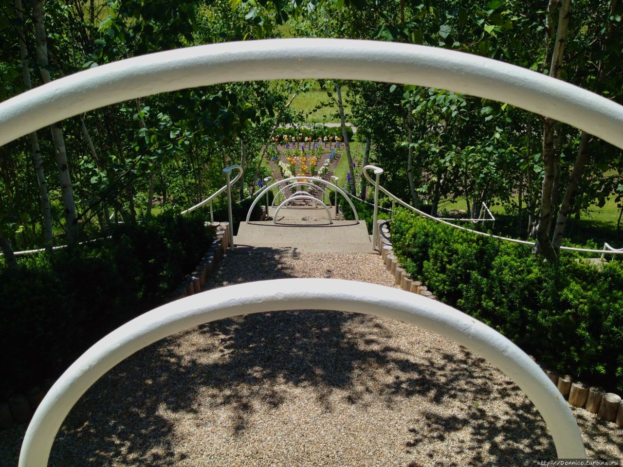 Наверху лестницы в виде дуг сделаны металлические ограждения, которые символизируют радугу или просто восходящее или заходящее солнце. Но это связанные явления. Ра — Дуга, то есть дуга египетского бога солнца Ра, неизбежно символизирует солнечный круг, то к чему мы все стремимся к единому источнику энергии.