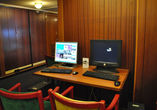 Wi-Fi только на 5 палубе. На ней же 2 стационарных компьютера, электрический чайник и микроволновка. Кофейный автомат за 15 SEK выдавал очень вкусный кофе. Стаканчики для него и размен по 5 крон — на респепшен.