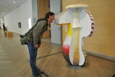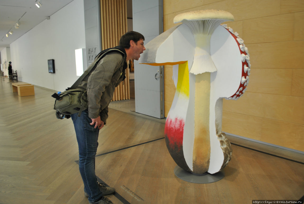 Во время нашего визита в холле были расставлены понадкусанные гигантские поганки-мухоморы. Возможно, грибы – это ключ к пониманию многих работ. Если ко времени вашего посещения грибов уже не будет, посмотрите фрагмент о современном искусстве из фильма «О чём говорят мужчины». Очень помогает не впадать в комплекс неполноценности, а смотреть только то, что действительно нравится.