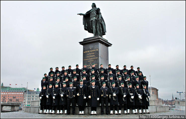 Что для этого требуется? Первое – надо найти мастера, подобного Рембрандту, и второе – подыскать обыкновенную стрелковую роту или, на крайний случай, только что сменившийся караул Королевского дворца Стокгольма. Ах, да, чуть не забыл, надобно иметь ещё под рукой яркую достопримечательность в виде памятника, желательно монарху, на фоне которого и будет сделан снимок.