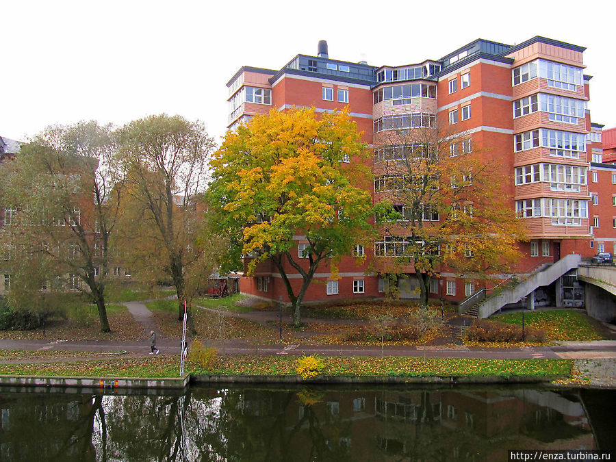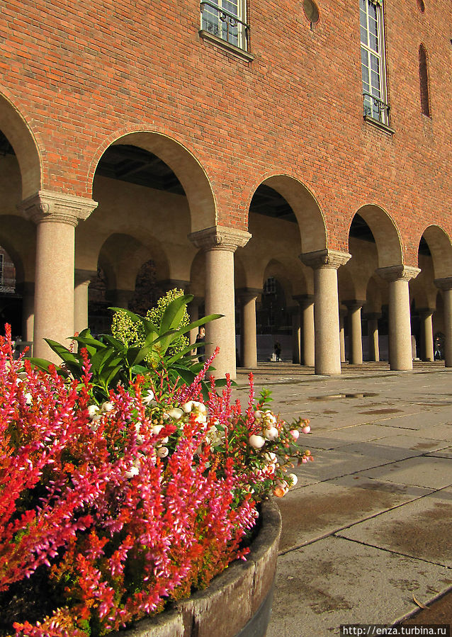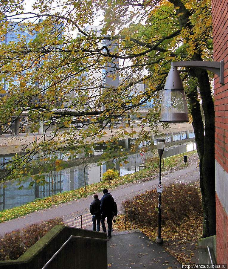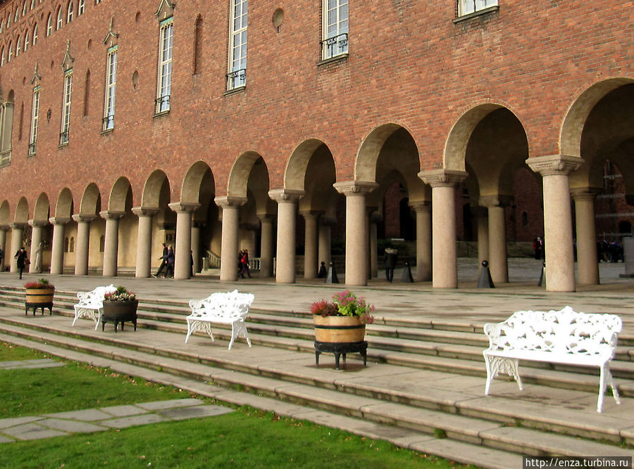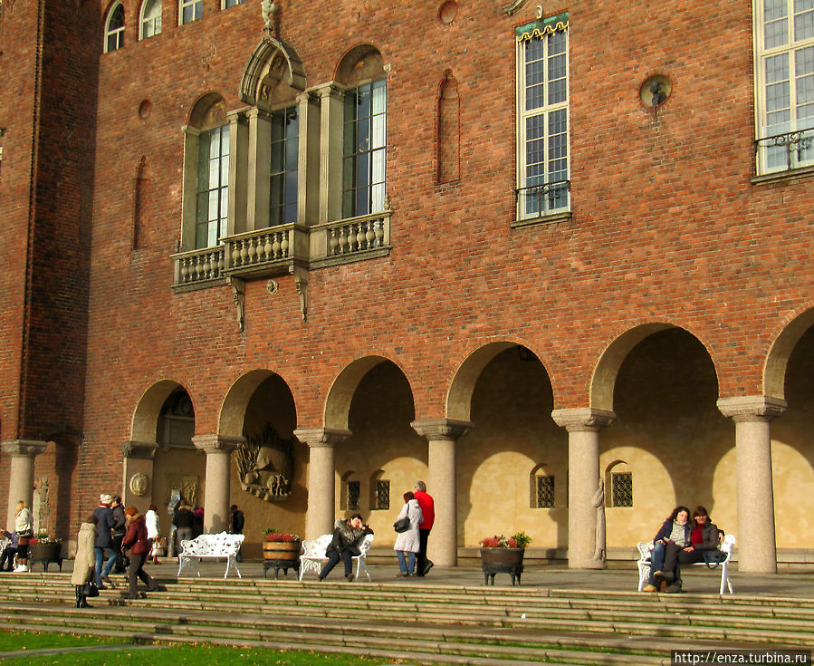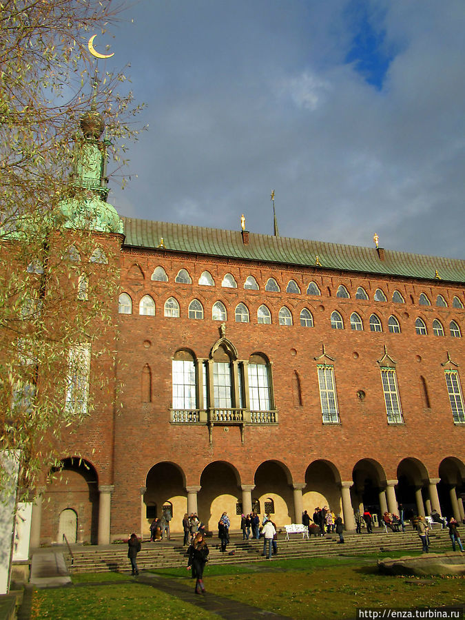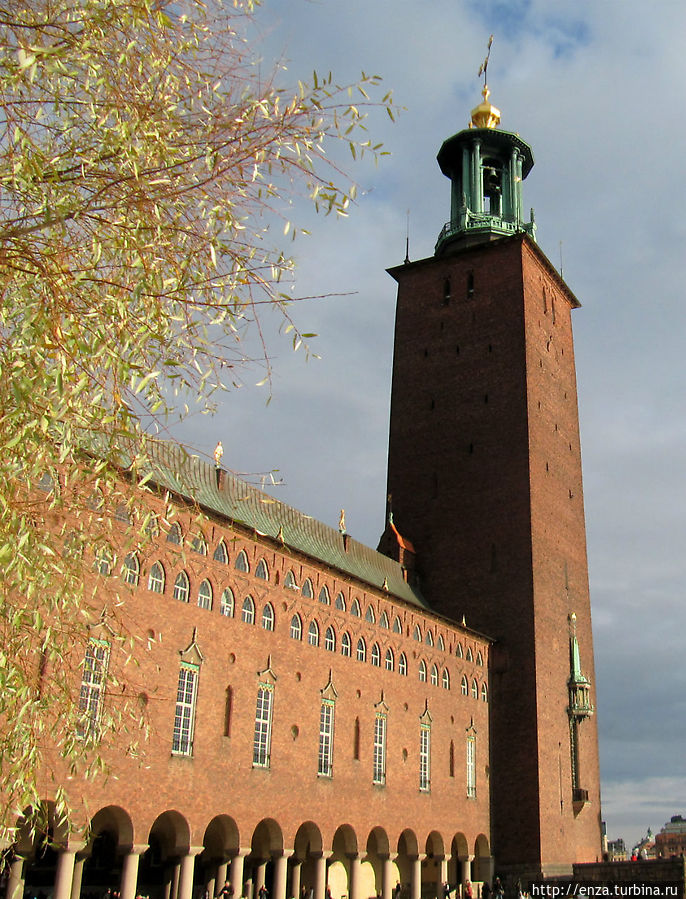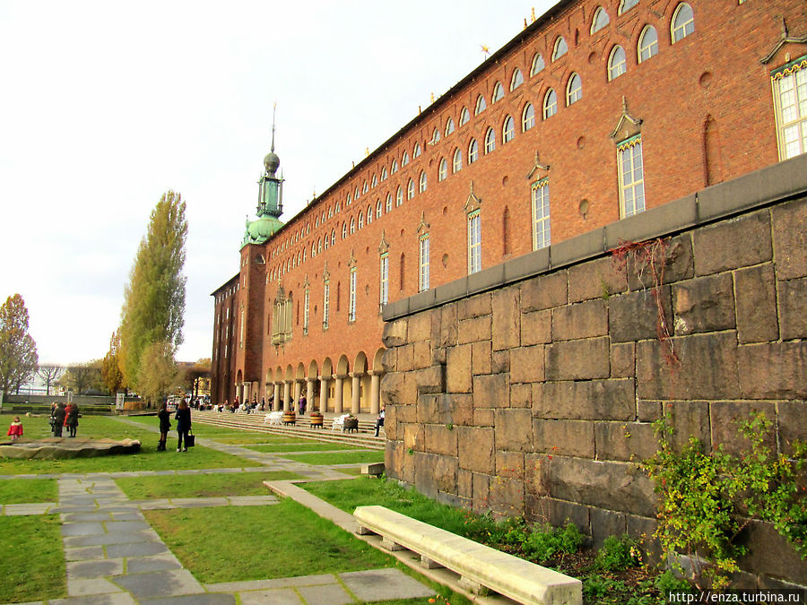 С Ратушей у нас на самом деле получилось «вокруг». Добрались мы до неё пешком аж из самого Östermalm. Перешли по мосту у Центрального Терминала на остров Kungsholmen, спустились по крутой лестнице на уютную и почти безлюдную беговую дорожку, которая даже для гугловских карт осталась безымянной и с удовольствием прогулялись к Ратуше.