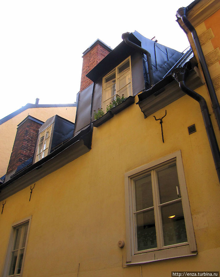На этом доме видны сразу два "фирменных знака" Гамла Стана — кран-балка, который использовали для подъема тяжестей на верхние этажи, и металлические Якоря Прогона (Girder Anchors), вмонтированные в стену и обозначающие расположение балок, поддерживающих строение. Таких металлических меток на домах Старого города полно, а вот кран-балку в путеводителях упоминают только один, по адресу на улице Prästgatan, 48. Хотя они тоже встречаются довольно часто. Только на улице Prästgatan таких кранов несколько.