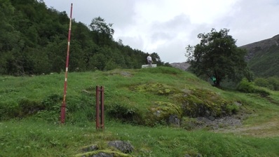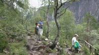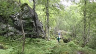 Мертвый камень "Nalasteinen". Раньше эта тропа связывала горные фермы и деревни с долиной. Если кто наверху умирал, его тащили вниз, в горах кладбищ нет. Дорога занимала два дня и вот у этого камня ночевали похоронные процессии. Бр-р-р. Слава б-гу туристы здесь в те времена не шастали.