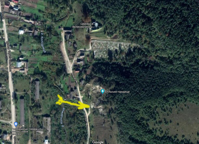 Вполне вероятно, это место тоже являлось частью древнеславянского городища. Увы, явных подтверждений лично я не заметил. К сожалению, карты гугл довольно часто весьма приблизительны, особенно когда речь идет о не популярных непроверенных местах. Тот же МапсМе сейчас (в августе прошлого года той отметки еще не было) указывает местоположение городища примерно на километр восточнее церкви, но на спутниковой карте в том месте просто густой лес.