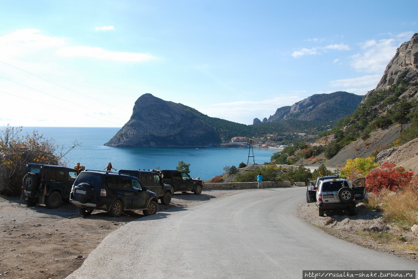 Пятиминутная остановка в красивом месте с видом на новосветскую Зеленую бухту и на гору Коба-Кая.