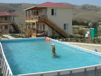 КОТОРЫХ ВЫ НЕ МОЖЕТЕ ОСТАВИТЬ ОДНИХ ДОМА, то у Вас должно появиться желание провести свой отпуск на природе в тишине и спокойствии, наслаждаясь шумом волн на малолюдных пляжах, в таком случае — небольшая база отдыха «Бугаз», расположенная в рекреационной зоне на берегу Черного моря, в бухте Бугаз, в 10 км. от г. Судак, на территории нового дачного кооператива, девиз которого «Дача у моря – море удачи», — именно то, что Вам нужно. Отдыхающие располагаются в новых двухэтажных домиках, в двухместных и четырехместных номерах. В номерах расположены кровати, шкаф, тумбочки, вентилятор, холодильник (в 4-х местном номере). Для 2-х местных номеров – холодильники на этаже. В доме на 1-ом этаже – четыре 2-х местных номера, на 2-ом этаже – два 4-х местных номера. На каждом этаже – терраса размером 2,5м. х 8,9м., на которой для каждой комнаты имеются столы и стулья. Дома с видом на море(до моря 50-100м.). Питание (как комплексное, так и под заказ) трехразовое в своем кафе: в хорошую погоду – на крытой террасе, в случае непогоды — в закрытом зале. Есть кухня (с посудой) для собственного приготовления пищи. Работает бар(большой выбор крымских вин, пиво). В виду отсутствия магазина, — кафе принимает и выполняет доставку ( по необходимости) заказов продуктовых и промышленных товаров. Санитарные удобства : — туалеты со смывом, душевые кабинки (хол./гор. вода) , умывальники — на территории. Имеются выходы на два пляжа, на одном из которых (песок, мелкая галька) ограниченное количество посторонних отдыхающих, а на втором ( крупные камни, естественные плиты уходящие в море, галька) — доступа посторонних нет. На расстоянии 200 метров — общий пляж. Территория большая, возможно минимальное общение между отдыхающими (за исключением кафе). Автостоянка. Каркасный бассейн размером 5м. х 10м. с морской водой. Видеозал. Караоке. Отмечается мощная энергетика данного места . Ароматы сухого степного, горного и морского воздуха благодатно воздействуют на органы дыхания. Люди, побывав у нас, приезжают вновь и вновь. Тишина, запахи трав и моря; прекрасные виды на обрывистый мысВдали — мыс Толстый, со своей подводной красотой. Как-то раз со дна достали "розетку" горного хрусталя.