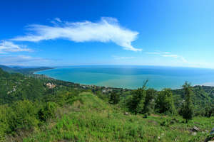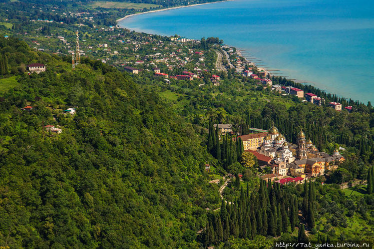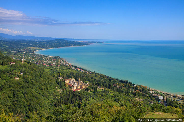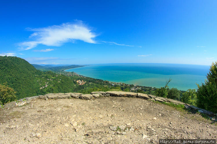 Поднявшись на вершину, взору открывается панорама всего Афона, а вид на монастырь — просто замечательный. Бескрайняя зелень и море. Правда после ночного шторма море у береговой линии не совсем чистое и голубое. Посидела там, помедитировала.. Подошли какие-то люди..разговорились..я им рассказала про жесть в Сухуми – они были рады, что уехали оттуда пару дней назад! Счастливые!