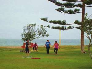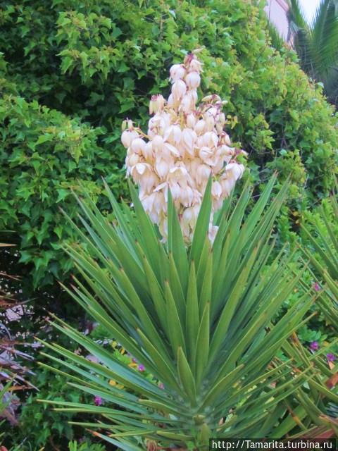 Вся территория была засажена зелёной мягкой травой и розовым тамариском.