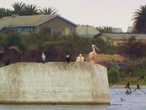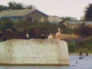 Это бухта реки Свакоп. Бело-розовые, тонконогие, они вышагивали, красиво изогнув шею.