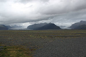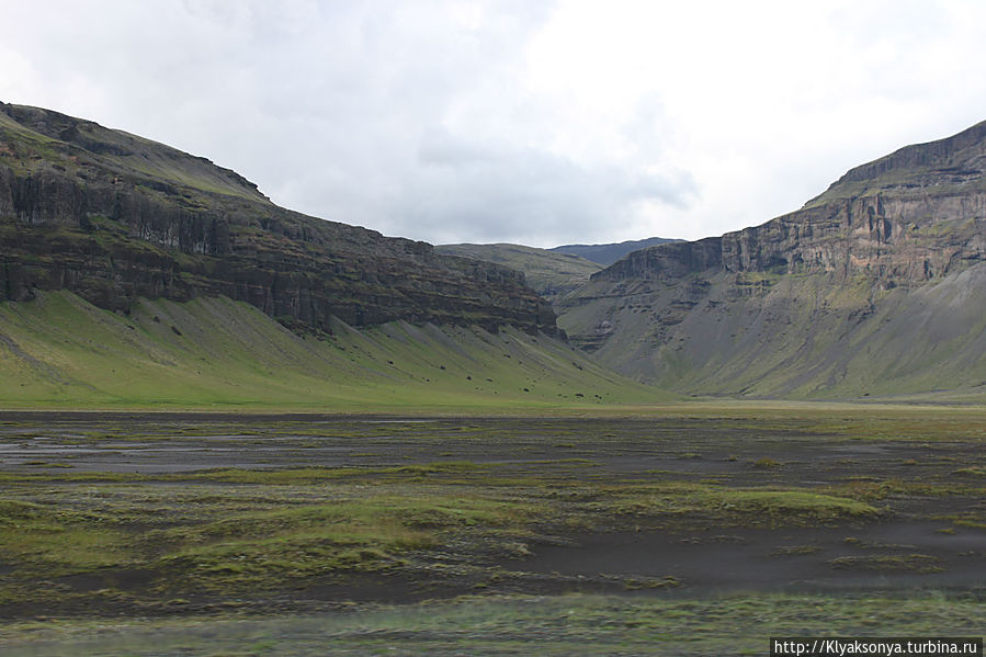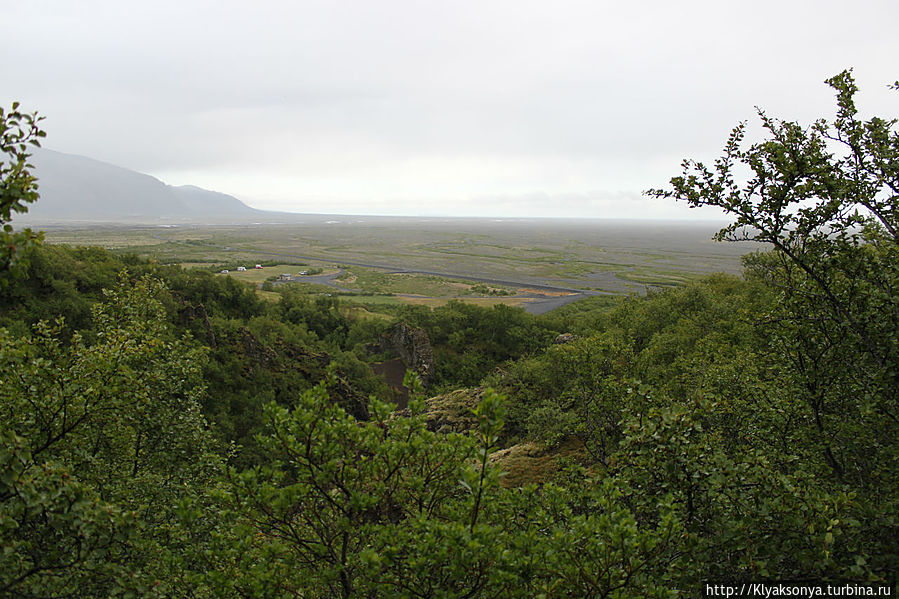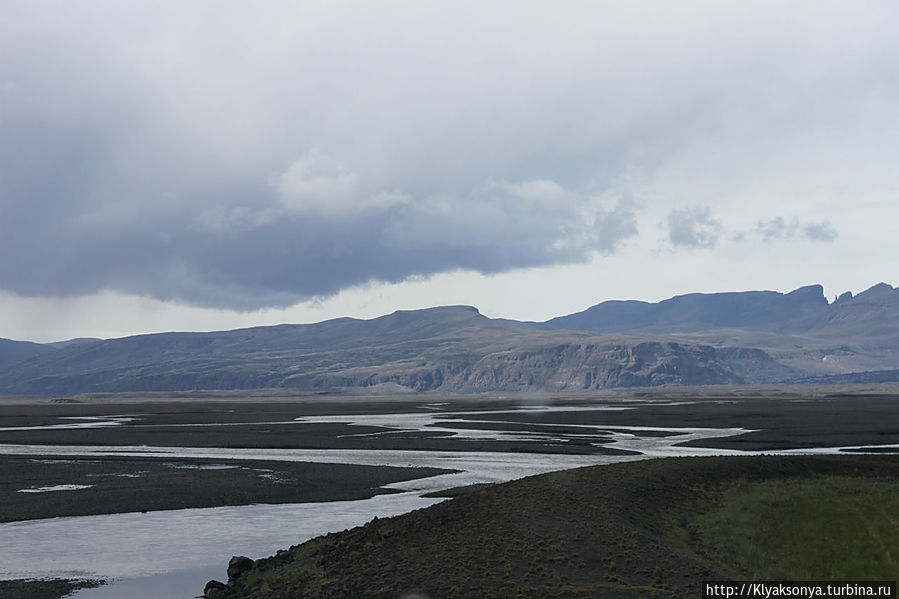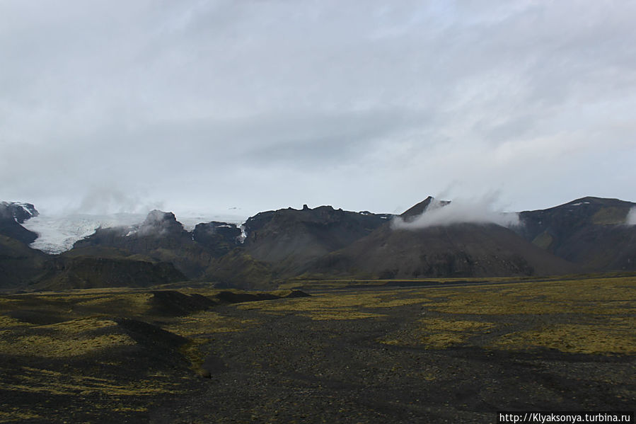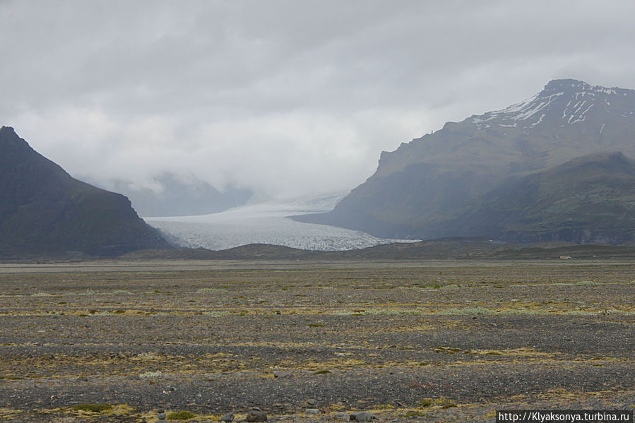 Справа вдалеке океан, а по левую руку спускались с гор языки ледника Ватнайокуль.