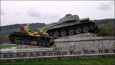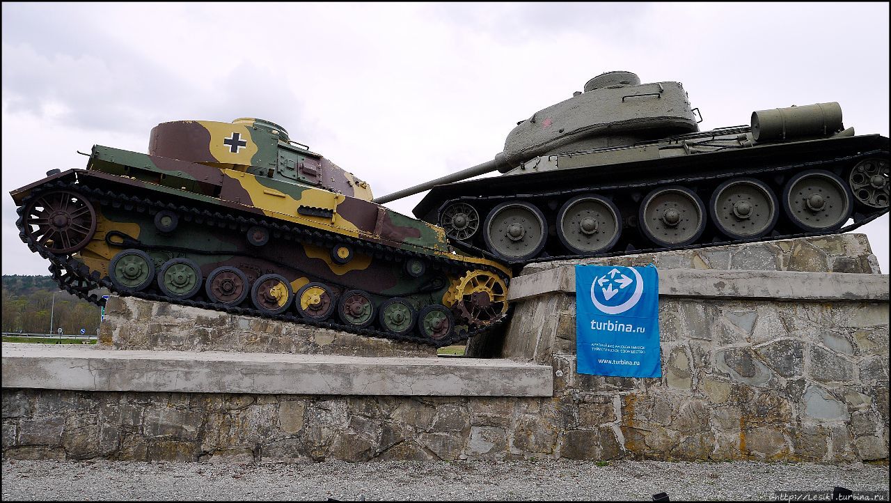 Два танка, советский Т-34/85 и немецкий Panzer IV, стоят, повернутые стволами друг к другу. Советский танк подминает под себя немецкий, нависая над ним, будто «втаптывая» в землю. Эмоционально это зрелище настолько сильно, что невозможно оторваться от него и кажется, что всё кругом замерло... даже стук твоего сердца. И несмотря на то, что вокруг кипит мирная жизнь, первое, что приходит на ум — это слова: