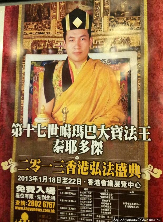 Тайная пещера 6-го Далай Ламы в горах Утайшань обратили внимание на ещё один симпатичный храм, но в который не стали заходить. И вот сегодня, (уже дома в Алматы) когда стал обрабатывать эту часть дневника, то решил поискать немного инфу про этот храм.Храм называется Dawenshu, посвящен Манджушри, как можно понять из названия. Является филиалом храма Пусадин (Холма Бодхисаттвы). Но самое интересное, что на картах Google есть всего 2 фотографии про этот храм, и одна из них — это фотография плаката информирующего посетителей, что с 18 по 22 января 2013 будет проходить медитационный курс с 17-м Гьялва Кармапой Тхае Дордже в Гонконге. Фото в Гугле старое конечно, но от этого не менее интересное. Кармапе не разрешают въезжать в материковый Китай, а в Гонконг запретить не могут. И вот в храме школы Гелугпа весит анонс крупного мероприятия школы Карма Кагью. Что говорит, что как на Утайшане, так и в целом в Китае есть достаточное количество последователей школы Карма Кагью. А ещё интересный нюанс в том, что я отправил эту фотографию моему другу Павлу Мартынову, чтобы прояснить информацию на китайском с плаката. И какого же было его и моё изумление, когда мы поняли, что Павел был на этом курсе с Кармапой в Гонконге, где впервые с Кармапой и повстречался!