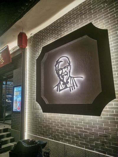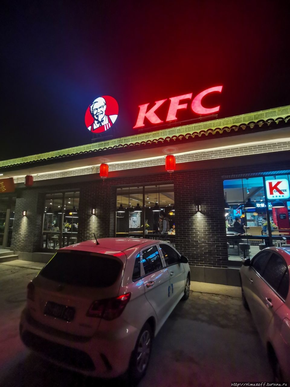 Дима с забитыми икрами идёт еле-еле, хочет воспользоваться такси, но такси рядом не оказывается. Плюс мы очень хотим есть и хотим есть нормальную еду. Вчера проезжая вверх по долине к нашему отелю, видели из окна автобуса KFC и очень хотели его найти. К сожалению не запомнили место, но было ощущение, что до него довольно далеко. Желание пройтись пешком отсутствовало, но желание поесть перевешивало усталость. На остановке автобуса мы встретили двух полицейских и стали допытываться, где находится KFC. Скачали картинки с логотипом, показали, они остановили нам таксиста, может он знает. Я написал по вичату Русу в Пекин, он подсказал как KFC звучит на китайском. "Ken de ji" или можно показать иероглифы 肯德基. Таксист сразу всё понял и без вопросов за 11 юань довез нас до прекрасного фастфуда, где каждый поел то что любит. Я заказал себе кофе, ролл с курицей и бельгийские вафли с мороженым, заплатил за это 56 юань, удовольствие неописуемое. А Starbucks звучит как "Си ба кэ", если что.