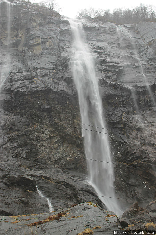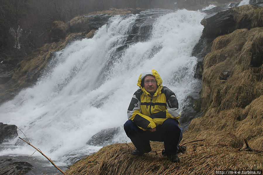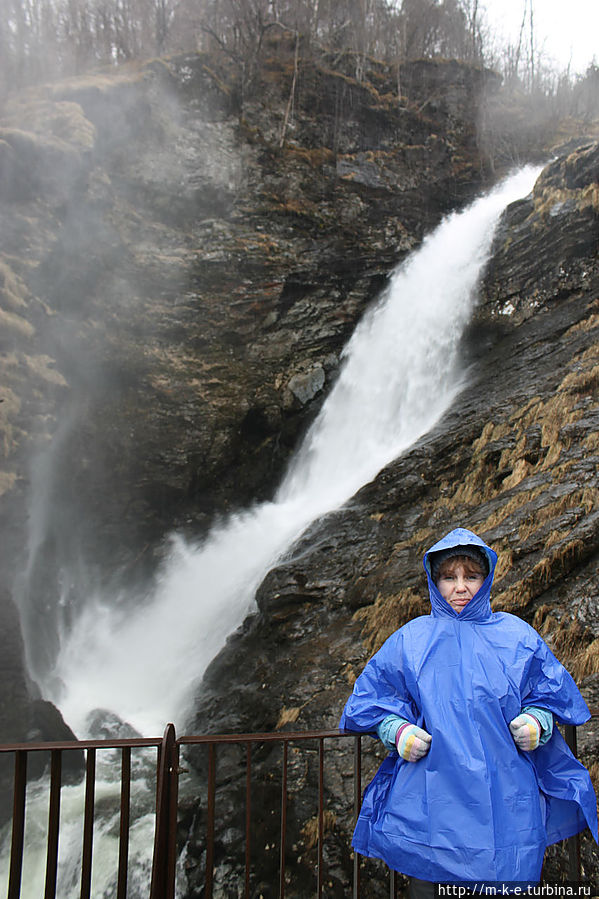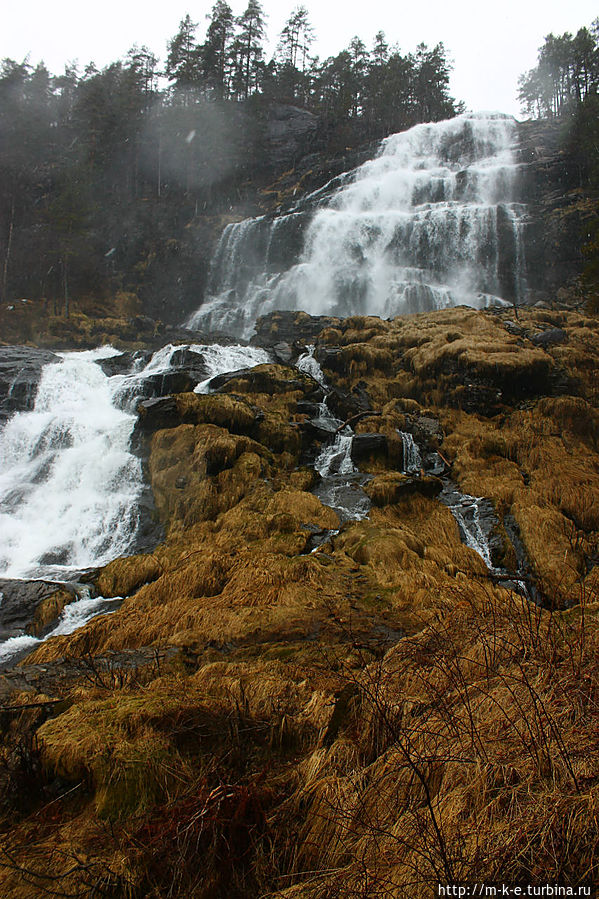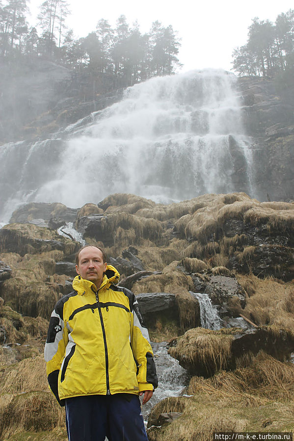 Буквально через 4 километра прямо на проезжающие автомобили дышит своей водной стихией водопад Svandalsfossen (59.62566 ; 6.29221). Этот водопад наиболее раскручен в этой местности. Его фотографии, а особенно фотографии лестницы рядом с ним, можно увидеть во многих туристических местах. Место стало популярным в 2007 году, когда здесь для подъема к водопаду были построены железные мостки. Они ведут на 40 метров вверх к площадке, где можно увидеть второй каскад. Первый падает прямо на дорогу. Мощность водопада регулирует сама природа, поэтому в период таяния снегов и больших дождей он захлестывает дорогу. В день нашего посещения водопад был смирным и не угрожал нам. На второй площадке есть несколько удачных мест для фотографирования стихии. Главное только не уронить фотоаппарат, заглядевшись на красоту. Про возможность остаться сухим речи и не может быть.