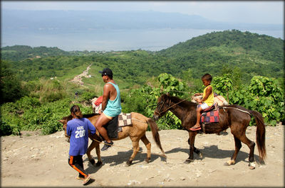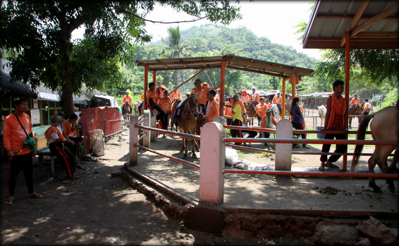 Чтобы добраться на самый верх нужно арендовать лошадь. На посадку была очередь из китайцев. К каждой лошади прикреплен гид, одетый в оранжевую майку с названием вулкана и номером на спине. Вот в этом месте вы садитесь на живой транспорт и начинаете свой путь.
