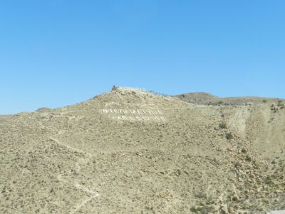 Через 10 минут после дома бабушки-троглодитки гид обращает наше внимание на один большой холм. Возле вершины из букв выложена надпись. Там обзорная площадка, на которую нам предстоит подняться.