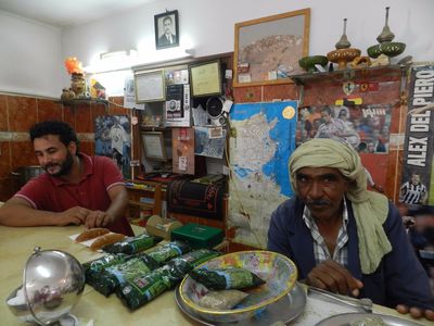 Выходим из автобуса, движемся вверх. Окружающее пространство поражает скудностью пейзажа. Безжалостное солнце выжигает всё живое, и потому маленькое зелёное деревцо, непонятно как закрепившееся корнями среди этой пустыни, воспринимаешь как настоящее чудо. Чем в этих краях зарабатывают местные жители, тоже не понятно? Нас атаковала целая группа парней, предлагая купить воду, а также сфотографироваться с пойманными птицами. Автобус остаётся внизу. После непродолжительного подъёма, народ начинает тискать птиц, фотографируя себя и окрестности. Здесь же и буквы "Матмата", которые мы видели с дороги. Спускаемся с горы, садимся по местам и едем на обед в город Матмата, о котором как раз и сообщает надпись. Ну а ребята, хозяева птиц, в ожидании новых туристов, заполняют собой узкую тень под одной из скал. Даже и не знаю, кого нужно больше жалеть? Наверно, в первую очередь людей, не имеющих нормальной работы, и каждый день сюда приезжающих. Жалко и пойманных ими птиц.