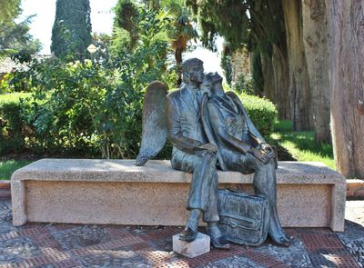 Т-с-сс... Не шумите! Здесь два ангела присели на скамейку на кратковременный отдых. Перевести дух, расслабить крылья, закрыть глаза на некоторое время, небходимо всем, даже ангелам. Шутка ли дело — оберегать нас, людей, без отдыха, 24 часа в сутки. Только присядешь отдохнуть — и снова кто-то нуждается в подставленных крыльях... При входе в городской парк Таормины, есть современная бронзовая скульптура — пара двух ангелов – молодых мужчины и женщины, в чудесной, изящной позе.