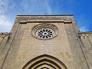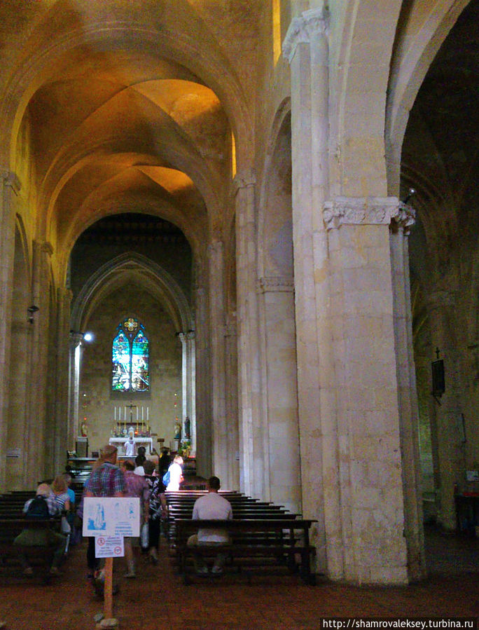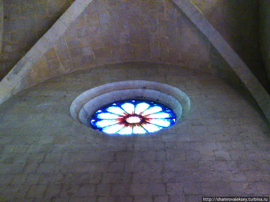 с великолепной розеткой окна. И интерьеры монастырской церкви достаточно просты. Внутренне пространство представляет собой латинский крест, разделёный двумя рядами колонн на три нефа, трансепт выделен готическими арками.Фотографирование в храме запрещено, но мне удалось сделать пару кадров.