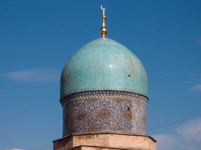 С правой стороны от медресе Кукельташ находится красивое здание, похожее на церковь, три купола которой соперничают с небом своей голубизной. Несмотря на необычный облик, это, конечно, мечеть. Новёхонькая, но с многовековой историей.