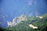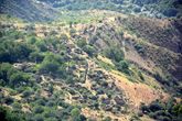 В глубине ущелья на небольшом ровном месте виден заброшенный монастырь, окружённый