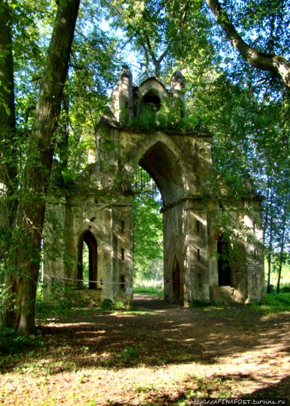 Самое примечательное сооружение из архитектурных украшений парка, сохранившаяся, пока, в глубине — часовая башня или трёхъярусные Готические ворота 1840 года постройки, с высокой стрельчатой аркой и сквозной башенкой.