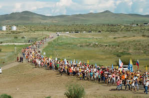 утром второго дня шествие 8км от лагеря к монастырю к Устуу с ламами.