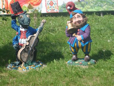 где стоит на страже сказочной страны богатырь.Лягушонок- музыкант спелся, а точнее сыгрался с гномом, весело звенящим колокольчиком.