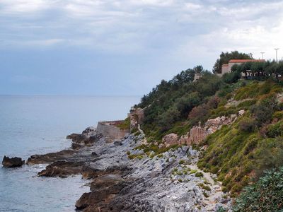 У подножия ресторанов берег очень живописен, он представляет собой целое нагромождение изъеденных эрозией и морскими волнами скал. Рискуя обломать себе ноги на этих каменюках, мы все же спустились к ним ради красивого фото...