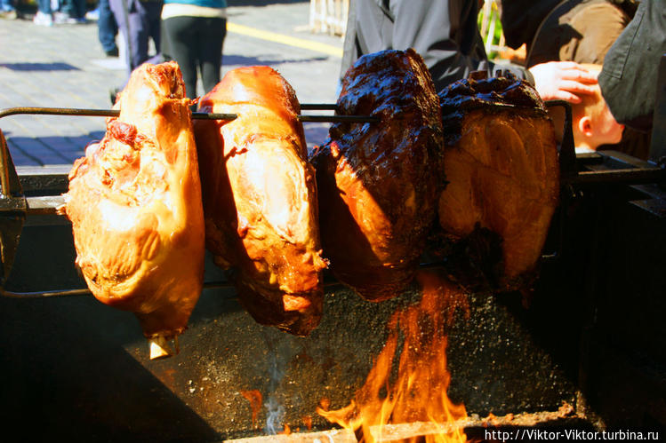 Прямо на площадях предлагаются чешские колбаски на гриле, а на вертелах жарятся свиные ноги, источая умопомрачительный аромат.