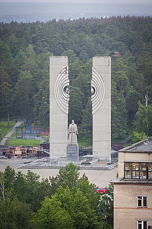 Памятник академику И. В. Курчатову. Позади него оборудованная площадка для роллеров, скейтбордистов, BMX'ров и т.п.