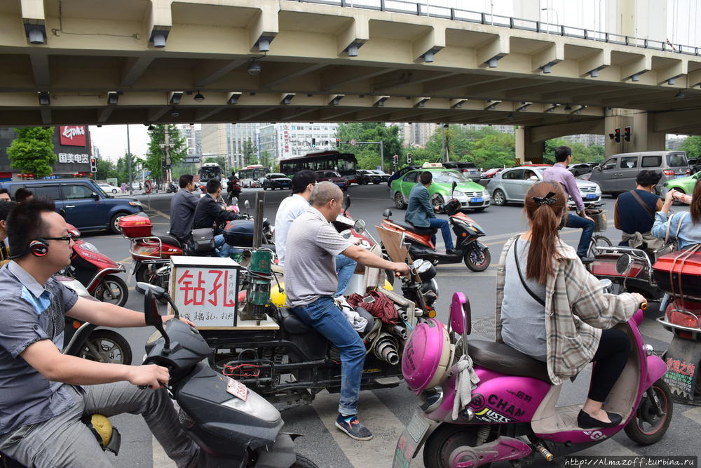 Наша гостиница на этот раз в центре города, но только центр огромен. Спросили, где погулять, потому что в заповедник к пандам времени нужно целый день. Пошли в сторону географического центра. Ходить через дороги довольно опасно, нужно только по переходам. Но на пешеходов всем плевать, особенно водителям мопедов.