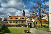 По правую руку возвышается башня бывшего костёла Святого Йошта. Почему бывшего? А потому что костёл, построенный в начале XIV века Петром Рожберком при тогдашней больнице и приюте для бедных во времена реформ, проводимых австрийским императором Иосифом II был секуляризирован, т.е., конфискован у церкви и продан крумловскому горожанину с одним условием — сохранить башню костёла. Это условие, как мы видим, было выполнено.