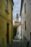 Но ведь короткий путь для ленивых, и можно прозевать массу интересных нюансов, поэтому опять поднимаюсь по улице Horni, до балкона напротив отеля Ruze, но налетели тучки и замок получается невыразительный. Возвращаюсь немного назад и ныряю на улицу Masna, откуда открывается классический ракурс на замковую башню в узком просвете средневековых домов и который есть у каждого, побывавшего в Чешском Крумлове. И нас сия участь не миновала. :) Но ведь красиво.