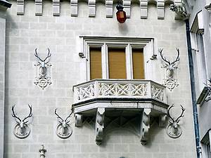 Ожидание своей очереди на экскурсию проходит незаметно. Постепенно туристы собираются в замковом дворе, и начинается знакомство с историей. Энергетика места настолько сильна, что просто кожей ощущаются происходившие здесь события. Многочисленные украшения стен гербами, резьбой и различными архитектурными изысками вызывают восхищение у посетителей. Белые дворовые стены этого не замка, а скорее дворца, украшены многочисленными оленьими головами. Рога настоящие, а сами головы сделаны из гипса. Под каждой оленьей головой имеется надпись, указывающая то угодье, где он был пойман. Шутливые туристы говорят, что надписи эти — фамилии хозяев рогов, полученных в этом замке.