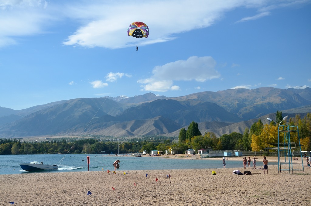 На Иссык-Куле был уже не сезон, вода была прохладная, так что «купались одни русские», благо их тут традиционно много. Отдыхающих катали по бухте на параплане. Запомнилось, как полетела женщина с маленькой девочкой. Девочка болталась, как сопля :)