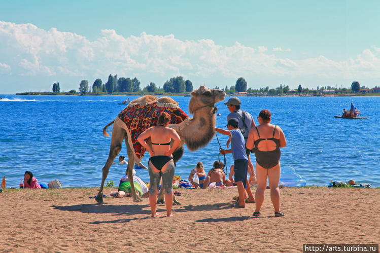 Прогулочный верблюд на пляже озера Иссык-Куль. Чолпон-Ата. Кыргызстан