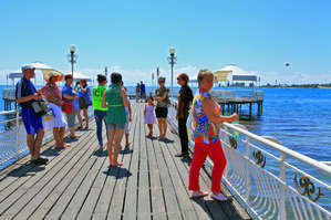 Туристы на пирсе Иссык-Куля в Культурном центре им. Чингиза Айтматова "Рух Ордо". Чолпон-Ата. Кыргызстан