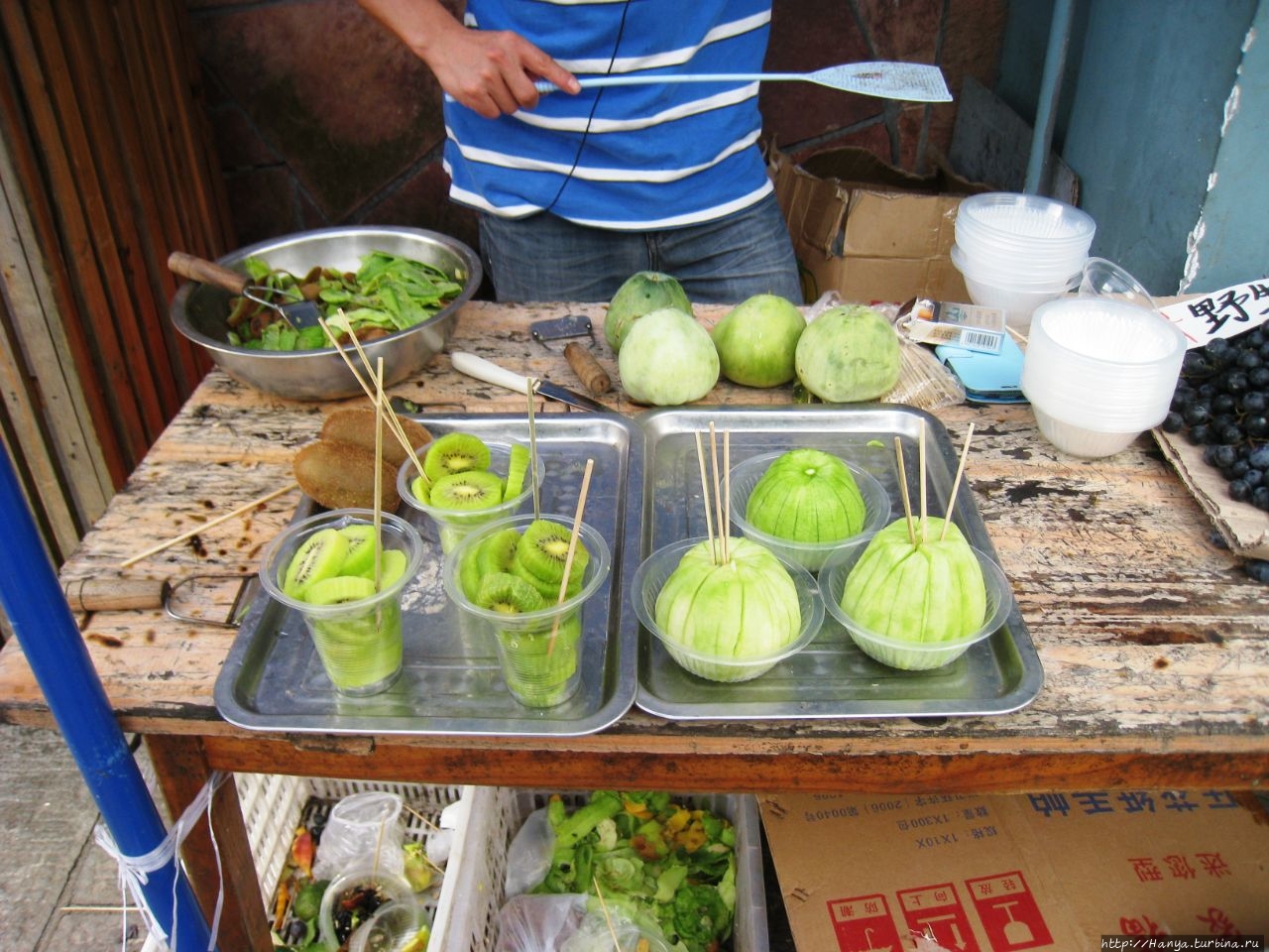 Памятник Хелонгу и Каменный Лес Пиков. Ч.21), но время неумолимо бежало вперед, план на сегодняшний день еще содержал массу интересностей, и Наташа стала нас подгонять, так как надо было еще пообедать. Мы даже предложили пропустить эту аттракцию, но Наташа настояла на соблюдении программы. Мы снова садимся на парковый автобус и едем налево по кругу до какой-то местной деревенской харчевни в местечке Yuanjiajie. Сразу на остановке мы притормаживаем возле фруктового лотка, где продают очищенные киви и еще какой-то фрукт типа яблока. Однако увидев мухобойку в руках у продавца, не решаемся вкусить предложенное.Дальше было еще интереснее. В этом поселке для туристов предусмотрено кафе с комплексными обедами. Вид этой едальни нас сразу ужаснул своей грязью и запахами, не очень свойственными китайской туриндустрии.