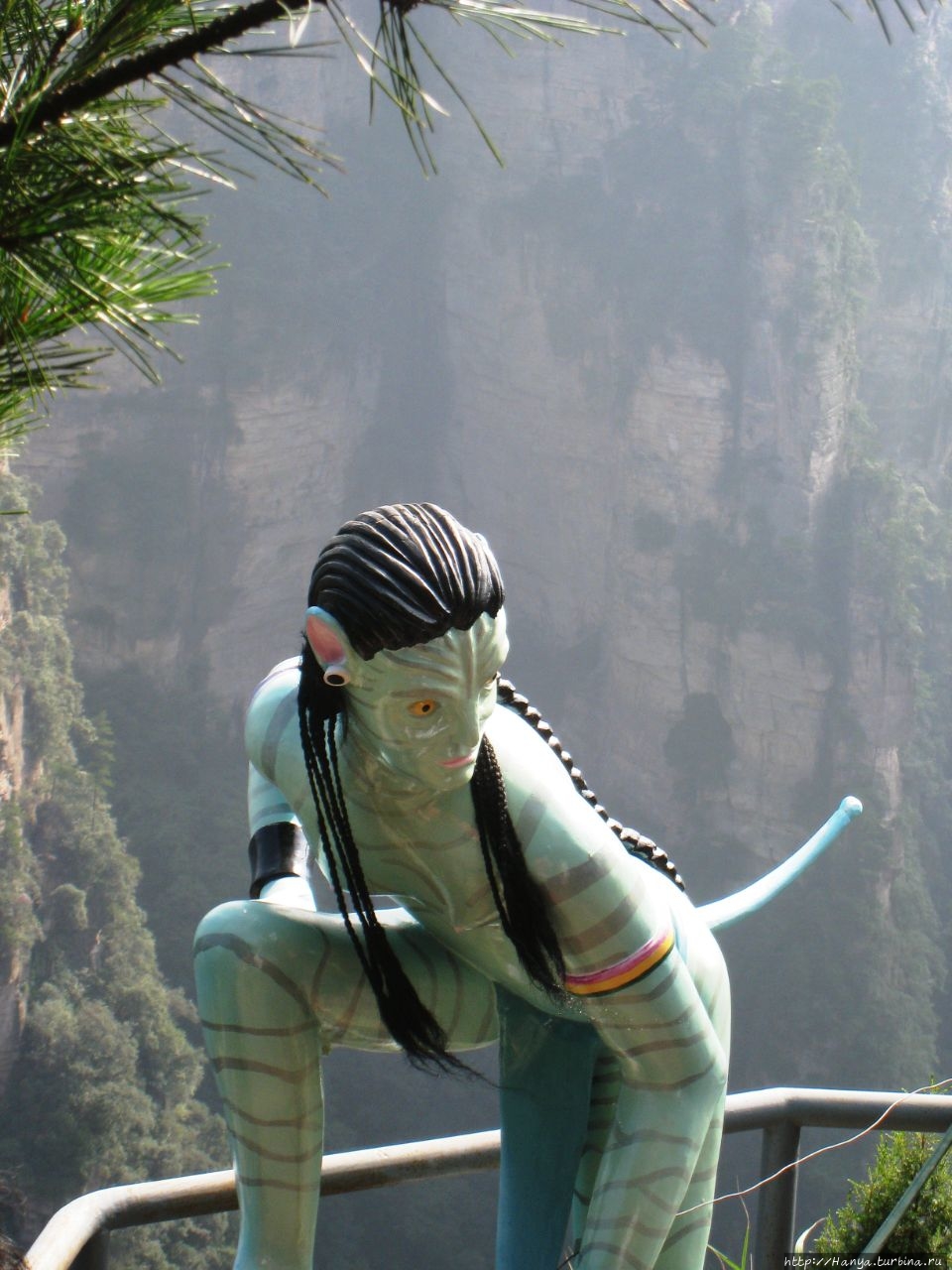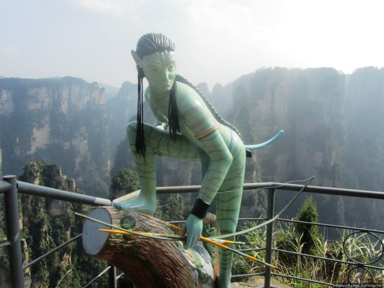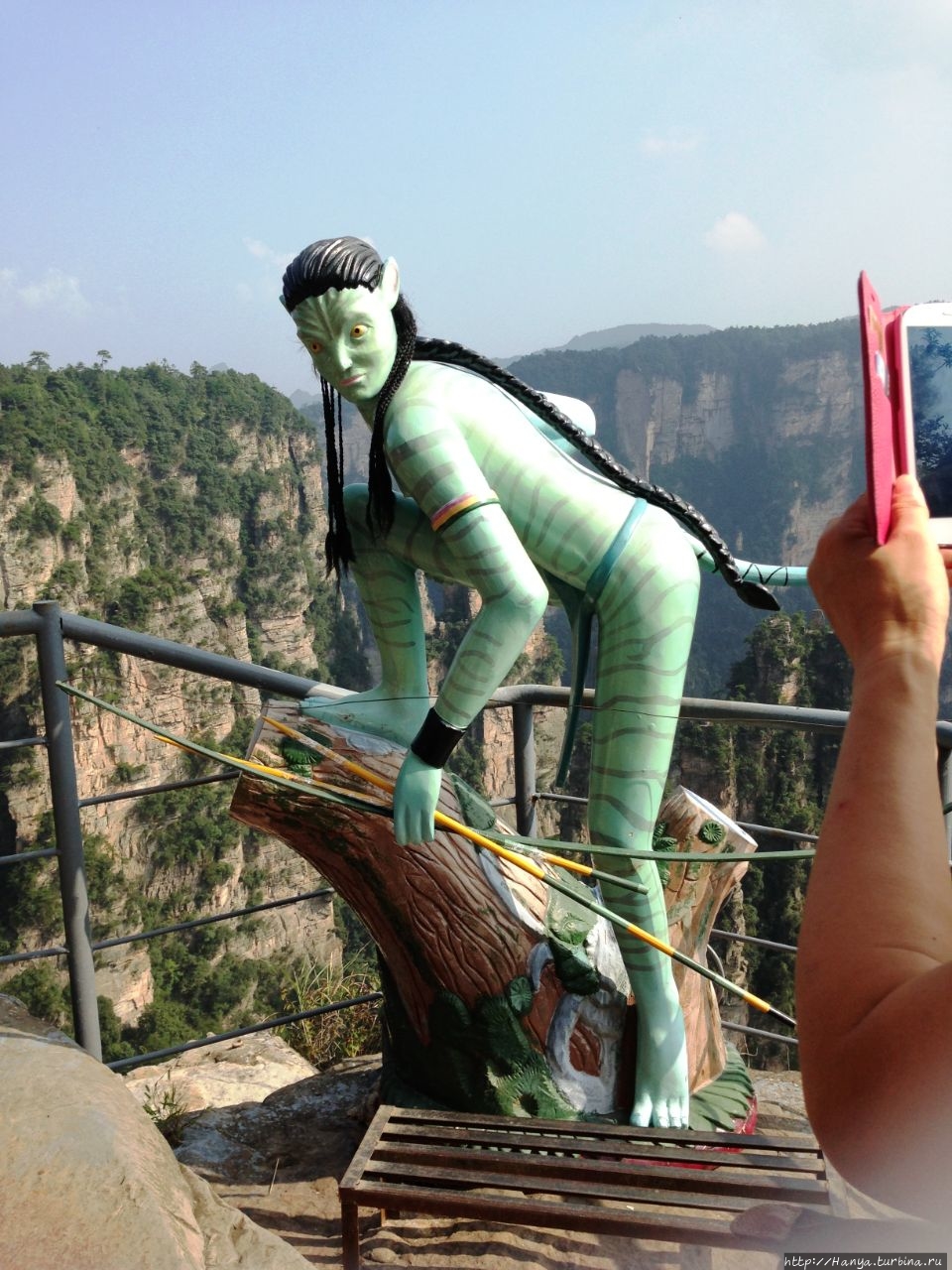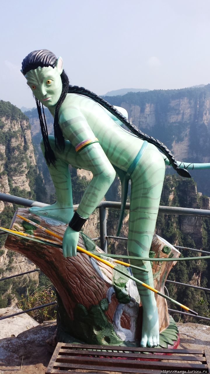 Икран – гордый орел Пандоры и его воплощение в Китае. Ч.26), а теперь идем навестить женский образ жительницы Пандоры. Ну, и если пройти чуть назад и спуститься вниз, то попадешь на площадку с многозначительным названием Enchanting Stage (Чарующая терраса), которую украшает фигурка синюшной героини фильма «Аватар» — принцессы племени Нави с планеты Пандора Neytiri. Сперва о Чарующей платформе (Mi Hun Tai), которая находится в полукилометре от Моста № 1.