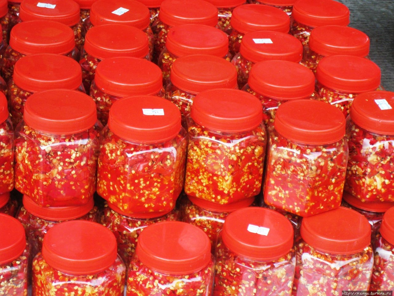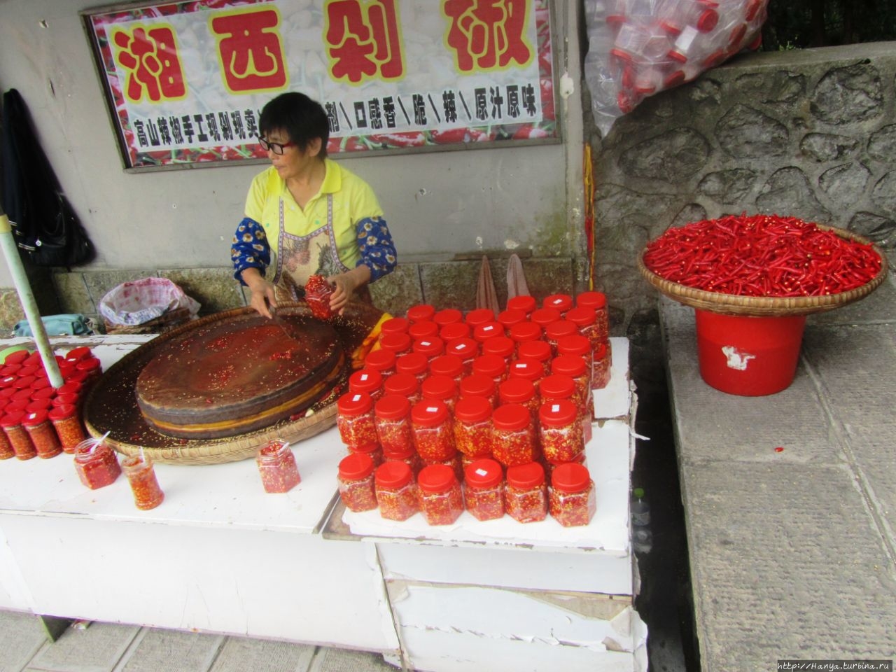 К слову сказать, эти усилия не стоили того, так как объем в какой-то мере удалось передать только на чисто пейзажных фото, да и то горные пики были не так близко здесь. Обалдевшие от шумных граждан страны, мы даже не пошли к многочисленным сувенирным лавкам здесь, хотя китайские сувениры заполонили весь мир, и где как не здесь покупать их? Заинтересовала только лавка с перемолотым перцем-чили в пластиковых банках – очень красочно!
