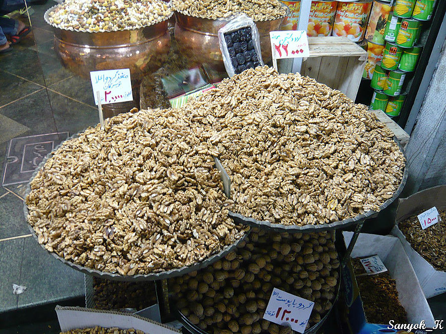 С другой стороны на любом базаре в Тегеране вы можете купить все, о чем так давно мечтали: сувениры из Исфахана, разукрашенные голубой эмалью, ковры, медную посуду из Кермана, нугу из Табриза, пашмак и пахлаву из Язда, сохат из Шираза, масгхати из Сирджана и многое другое. Добавьте в ваше изображение горы орехов в бронзовых вазах: грецкий, кешью, фундук, фисташки и миндаль в кожуре и без, несколько сортов фиников, сотни различных приправ, названия которых я даже и не знаю, местные инжир, гранаты, мандарины и апельсины, а также авокадо, манго и маракуйя, привезенные из соседнего Пакистана.