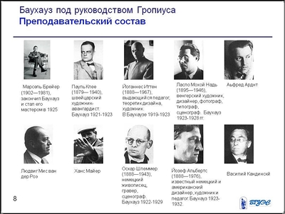 Под его началом школа стала настоящим международным центром авангарда. Гропиусу удалось собрать под одной крышей талантливых художников, дизайнеров, архитекторов. Так, например, мастерскую живописи и фрески возглавил Василий Кандинский, витражной живописи – Пауль Клее, обработки металла – венгерский художник и теоретик искусства Ласло Мохой-Надь,