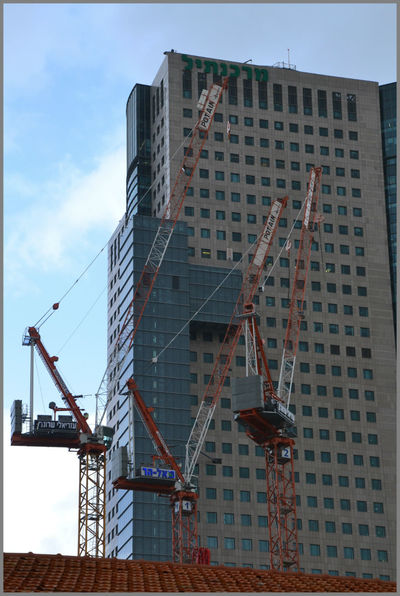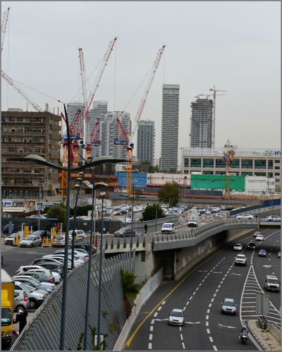 Прямо с железнодорожной станции попадаем в одну их башен Азриэли по пешеходному мосту над самой оживленной трассой Тель-Авива, да и всего Израиля — Аялон. Оказавшись на мосту и оглядевшись, можно заметить, множество строительный кранов — Тель-Авив строится.