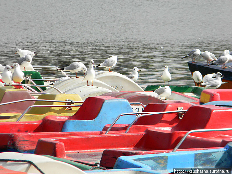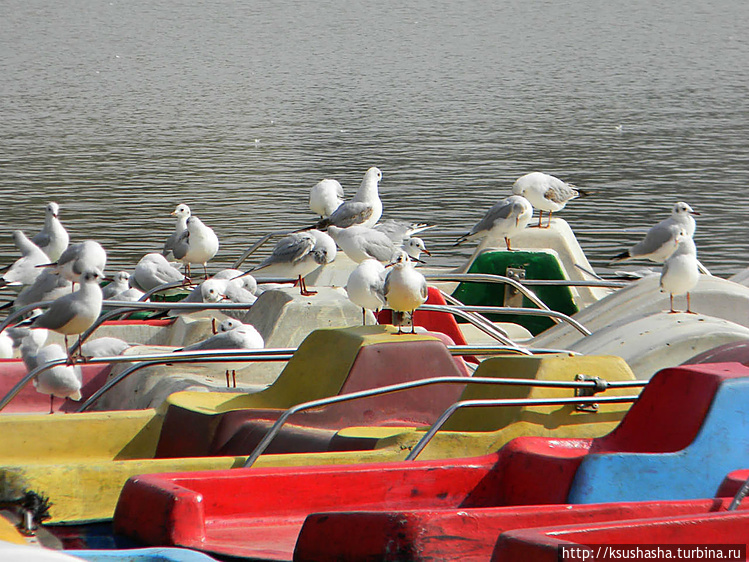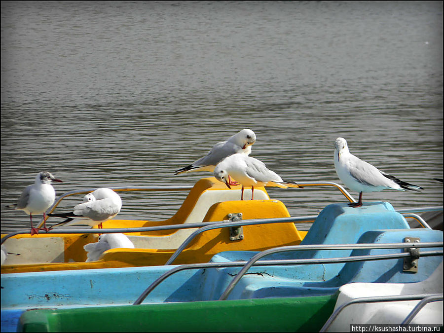 На большом искусственном озере посреди парка летом будет полно посетителей, но пока лодочки и водные велосипеды "обживают" огромные стаи чаек.