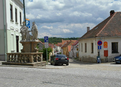 Дома стоят очень близко друг к другу. Наверное, соседи всё про всех знают :) Здесь тихо и спокойно, никакого шума с площади. Пройдя мимо церкви, я вышла на перекресток, где стояла скульптурная группа: Мария и Иосиф с маленьким Иисусом. Должно быть, здесь и проходит дорога "На плитках", ведущая в старую часть города. А эта скульптура – ее часть. Вниз от скульптуры уходила очень симпатичная улица, и опять нигде ни души. Мне показалось, что для такого маленького городка многовато дорожных знаков, но правила есть правила:
