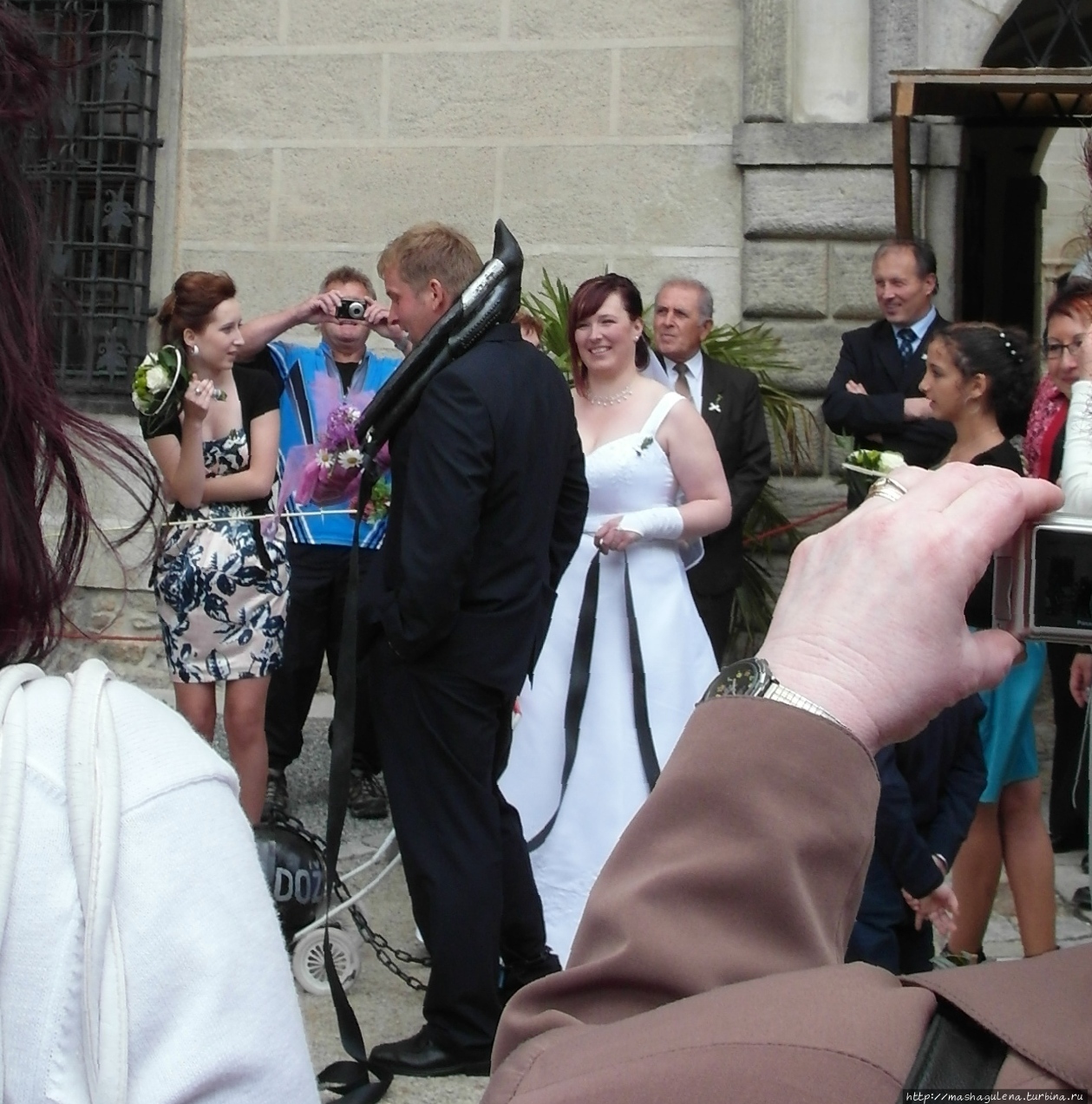 Возвращаюсь обратно, чтобы соединиться со своей группой, которая осматривала интерьеры замка. А тут во дворе такая приятная вещь, как свадьба. Жениха уже окрутили, надели на шею ярмо, к ногам прицепили пудовую гирю. Невеста, сдобная девица, очень довольна: у нее в руках бразды правления семьей: